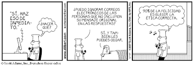 Me encanta Dilbert. Creo que nunca lo he comentado por el blog ni he subido tiras. Por si alguien no lo conoce son unas tiras cómicas escritas por Scott Adams que satirizan las políticas de empresa, la burocracia y los jefes que no saben nada acerca de cómo hacer el trabajo que exigen a sus empleados. El contexto es en algún tipo de empresa de informática, pero no es necesario tener la menor idea sobre ordenadores para disfrutarlo. En la wikipedia tenéis más detalles; es una tira bastante famosa —a punto de cumplir los veinte años— de modo que encontraréis más información por internet si os interesa, así como montones de tiras.